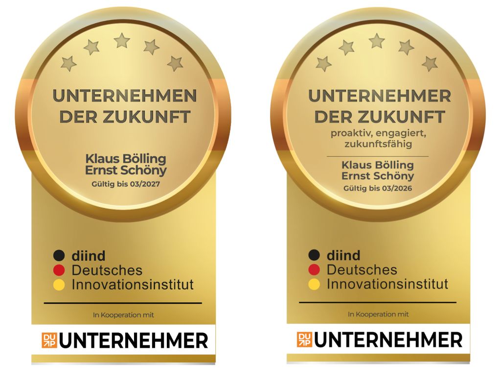 Von eben diesem Institut wurde unseren Geschäftsführern Klaus Bölling und Ernst Schöny auch die Auszeichnung „Unternehmer der Zukunft“ verliehen. Das Siegel wir laut DIND an zukunftsfähige UnternehmerInnen verliehen, die sich durch die einzigartige Fähigkeit auszeichnen, aus Erfahrung zu lernen und diese geschickt mit den Herausforderungen von morgen zu verbinden. Ihre Umsetzung erfolgt nachhaltig, klar und mit dem starken Rückhalt der Mitarbeitenden.